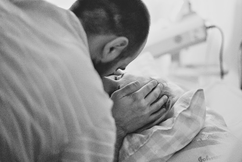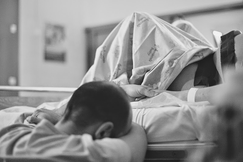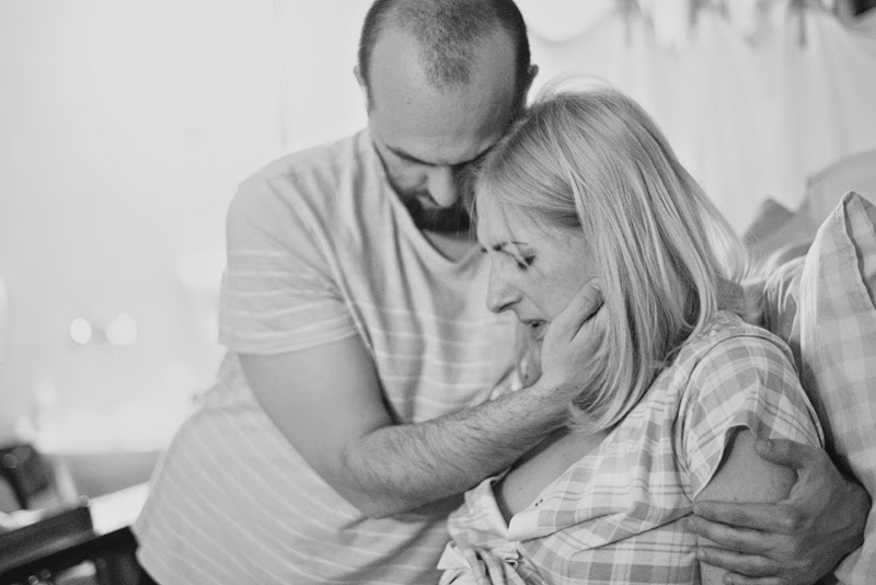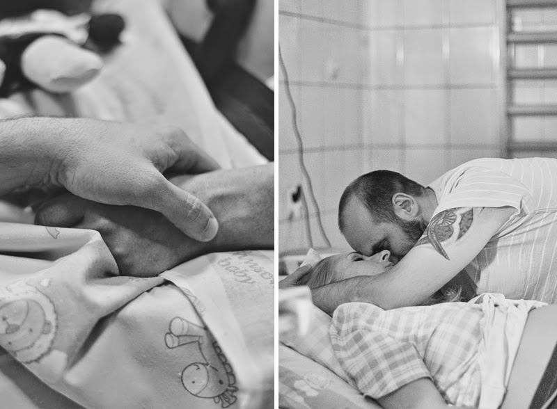 Z punktu widzenia fotografa – reportażysty schody zaczęły się w drugiej fazie porodu, która de facto była bardzo szybka. Ni z tego, ni z owego pani położna zasugerowała, że może zostać tylko jedna osoba towarzysząca, czego zupełnie się nie spodziewałam. Na szczęście jakoś z Grzegorzem (bo samej rodzącej nic już wokół wówczas nie interesowało) na szybko przekonaliśmy ją, że schowam się w rogu sali za aparaturą medyczną i nikomu nie będę wchodzić w drogę. Tak też uczyniłam, bo personelu medycznego zrobiło się nagle sporo – z jednej położnej zrobiły się cztery dodatkowe osoby (pielęgniarki i lekarki). A więc niemały tłumek. I ja nieszczęsna zostałam wtłoczona w ten kącik sali, za tą aparaturą. Miałam tylko dwa „okienka” z widokiem na rodzącą – gdzieś pomiędzy Grzegorzem, lekarką i położną, którzy „obstawili” ją z wszystkich możliwych stron :) I tak próbowałam coś uchwycić przez te „okienka”. Jak na warunki, w których ostatecznie przyszło mi uwieczniać kluczowy moment (którego o mały włos w ogóle bym nie uwieczniła! ;) – myślę, że poradziłam sobie nieźle. Kiedy malutki Maksymilian pojawił się na tym świecie – nie ukrywam, że poczułam duże wzruszenie.